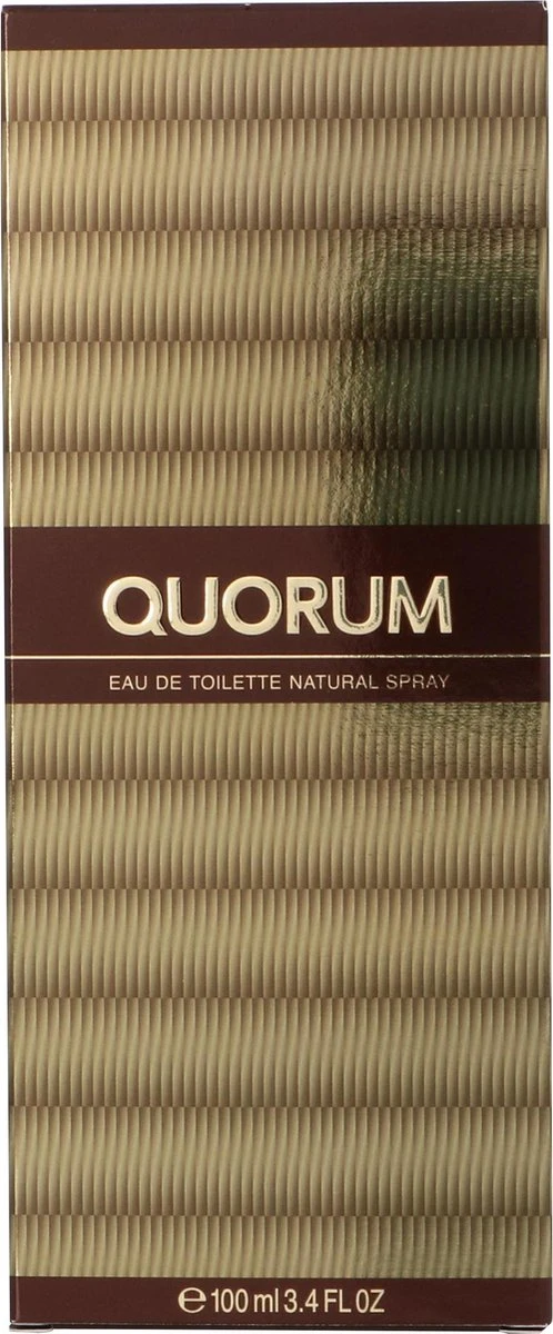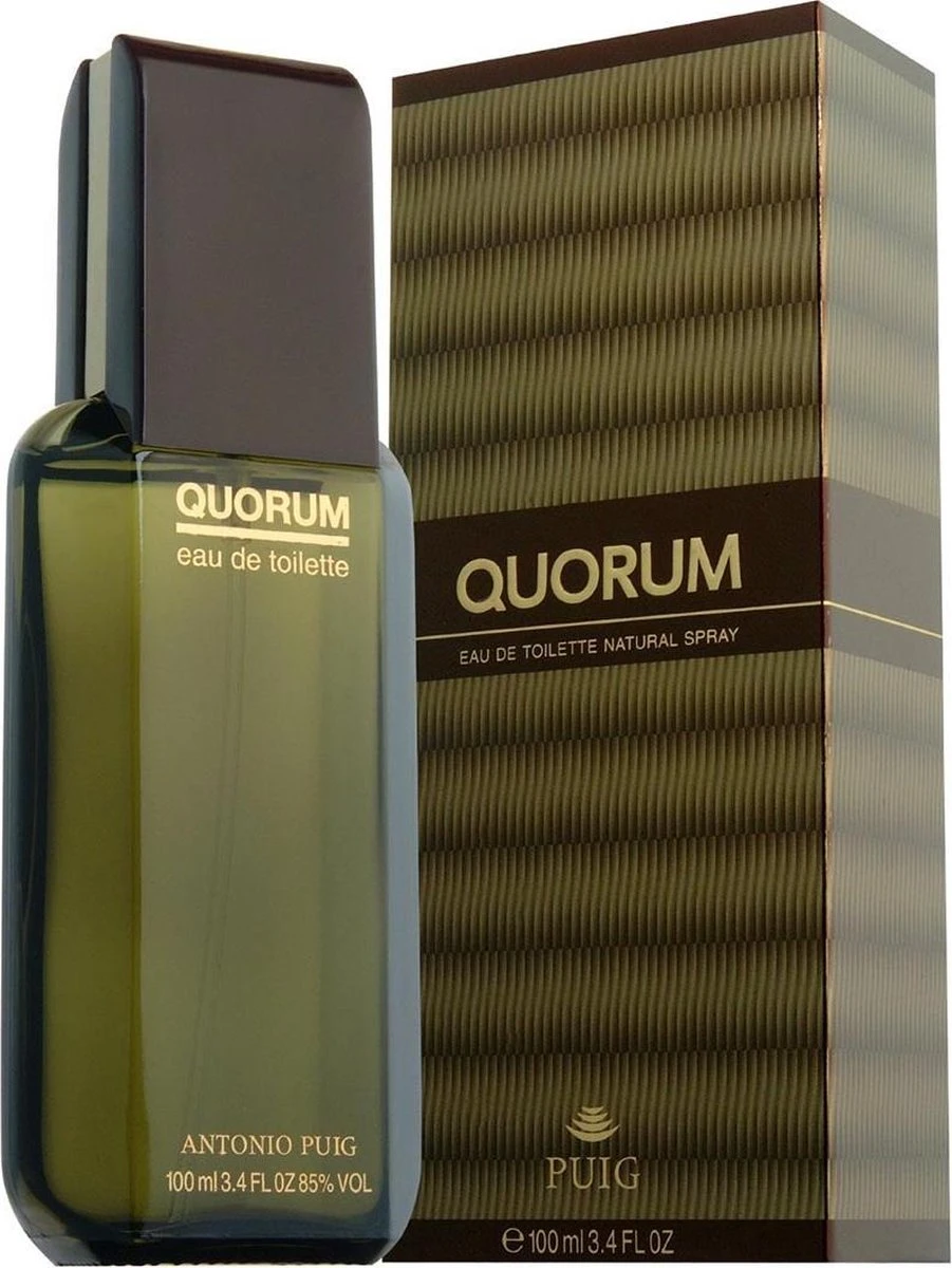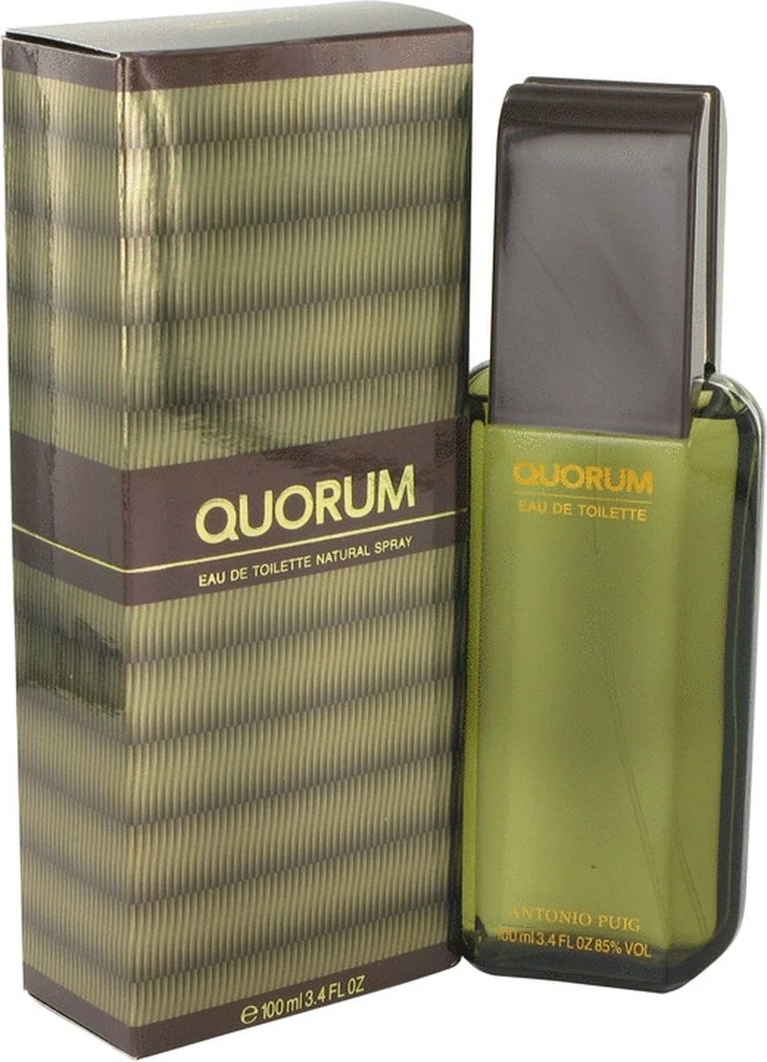 Antonio Puig Quorum Eau de Toilette 100ml Spray. Een klassieke warme maar ook intieme geur. Top: Bergamot, Artemisia, Komijn. Citrusvruchten Midden: Pathouli, Jasmijn, Den, Sandel, Cyclamen en Anjers Basis: Leder, Tabak, Mos, Amber en een vleugje Wierrook